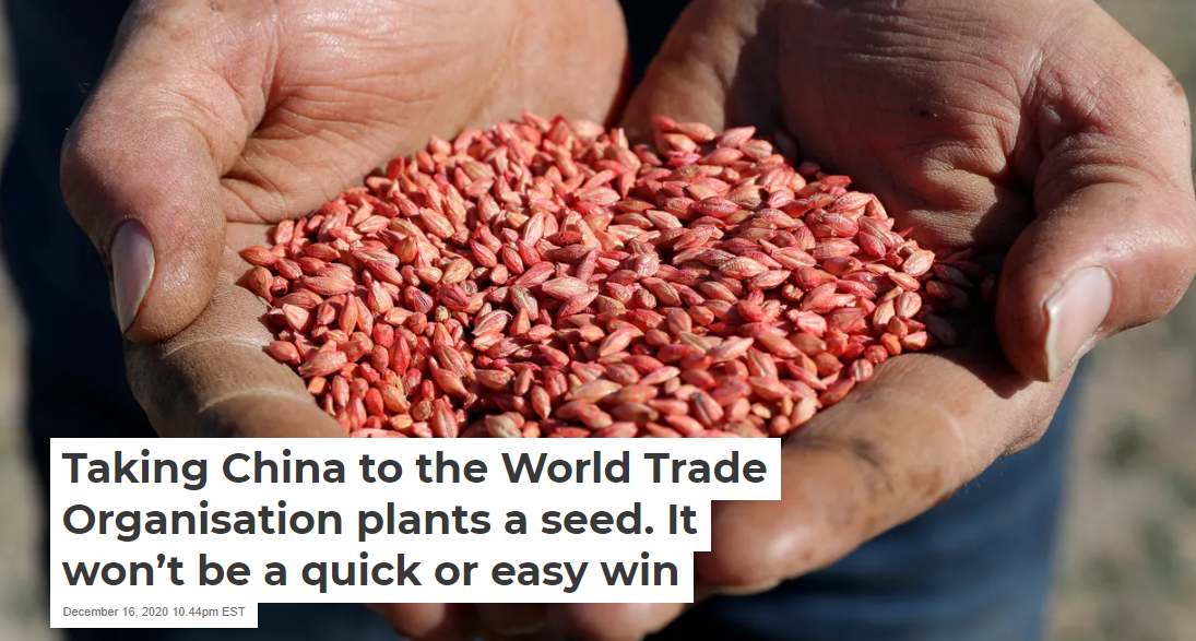 It is the five-year 80.5% barley tariff China imposed in May that Australia will take to the World Trade Organisation. More than half of all Australian barley exports in 2019 were sold to China, worth about A$600 million a year to Australian farmers.