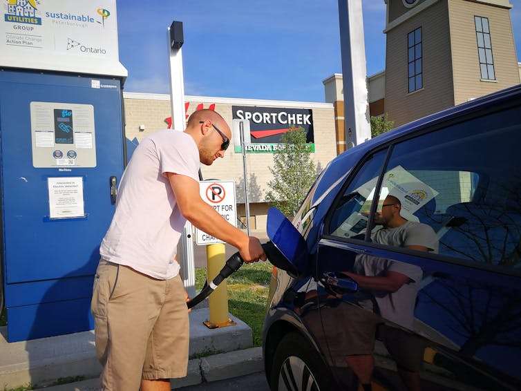 A man plugs in his Volkswagen e-Golf at a charging station in Peterborough, Ont., in June 2018.