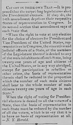 However, as Eric Eisner, a history Ph.D. student at Johns Hopkins University, and David B. Froomkin, a law professor at the University of Houston Law Center, explain, that would have run afoul not only of those states’ laws but also of another provision of the Constitution: The 14th Amendment says that if a state disenfranchises any of its voters, that state loses a proportional amount of its seats in the House of Representatives.