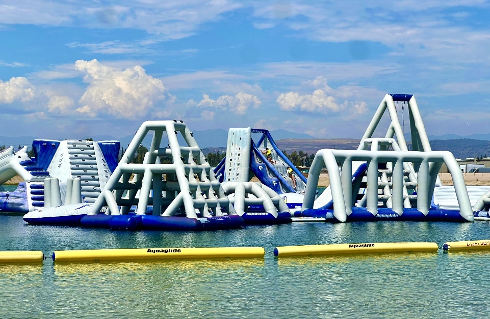 The heart of the park is its Aquaglide Ring Monsoon XXL—a towering, floating inflatable course that challenges both kids and adults alike with slides, climbs, and jumps.