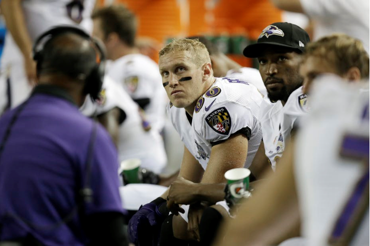 Baltimore Ravens tight end Konrad Reuland sat on the sidelines of a preseason game in September 2015 against the Atlanta Falcons. AP Photo/Brynn Anderson