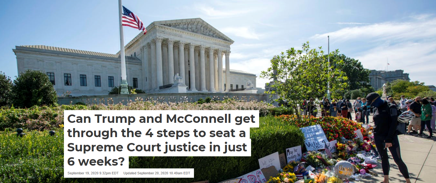 The 2020 presidential election was just 46 days away on the day of Bader Ginsburg’s death, but McConnell has apparently abandoned such considerations this time around. Trump tweeted on Sept. 19 that he would nominate a replacement “without delay.”