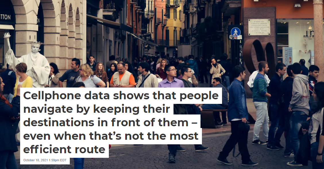 Instead of calculating the shortest path, people try to point straight toward their destinations – we call it the “pointiest path” – even if it is not the most efficient way to walk.