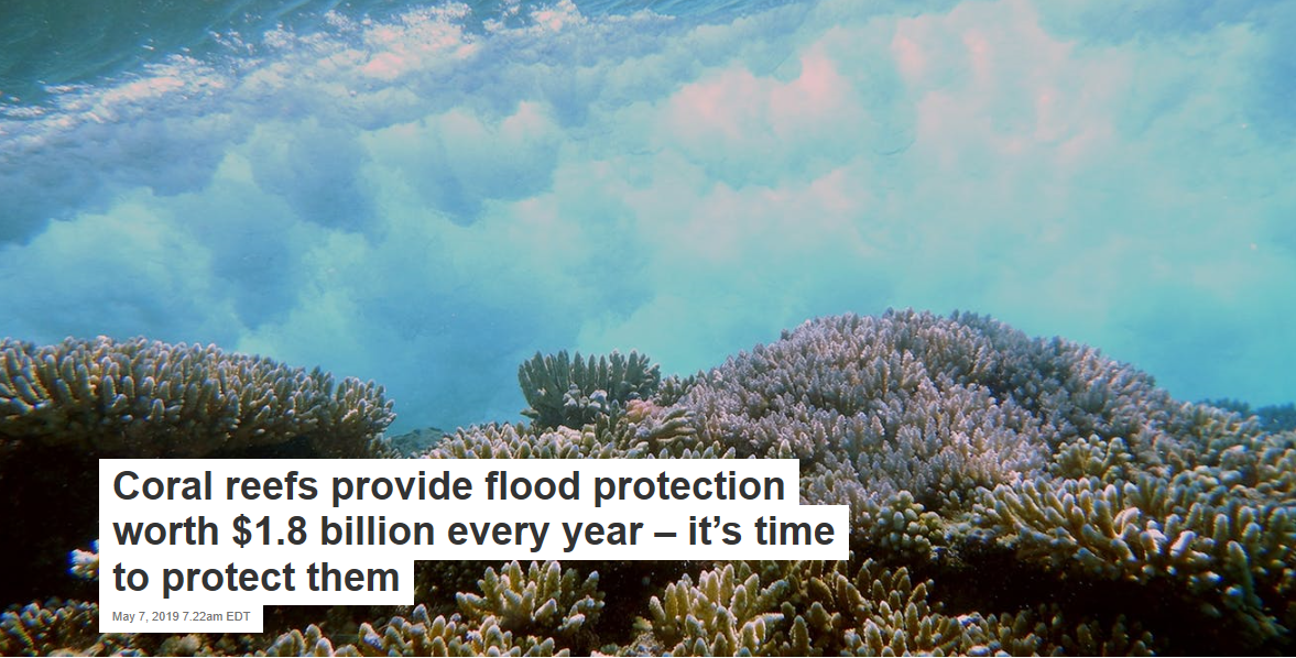 Reefs act just like submerged breakwaters. They “break” waves and drain away their energy offshore, before it floods coastal properties and communities. This is an enormously valuable function. In 2017, tropical storms alone did over $265 billion in damage across the nation.