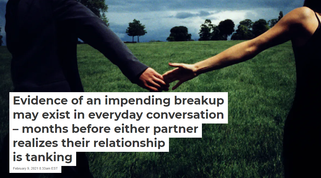 In our recently published study, we were able to show that people’s language subtly changes in the months and weeks leading up to a breakup – well before they’ve made a conscious decision to end things.