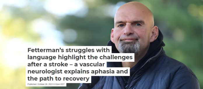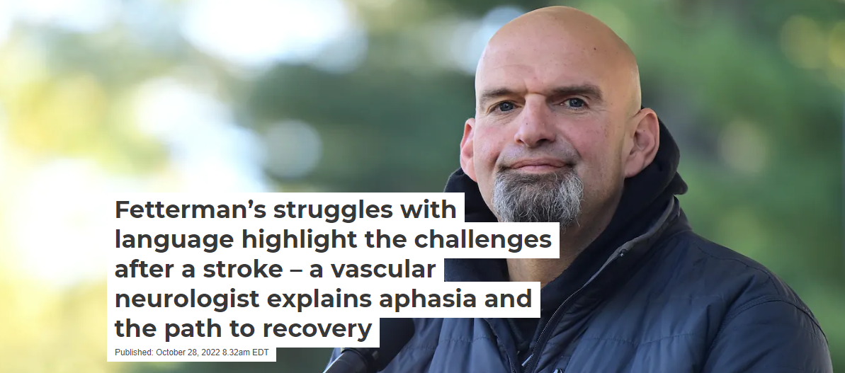 Fetterman suffered a stroke on the way to a campaign event in May 2022. His apparent post-stroke neurological effects – including auditory processing and speech issues – have caused some to question his fitness for the role and have become a central factor in the Senate race. The Conversation asked Andrew Southerland, a vascular neurologist specializing in stroke and cerebrovascular disease who sees many patients like Fetterman, to explain what Fetterman’s case can teach us about stroke recovery.