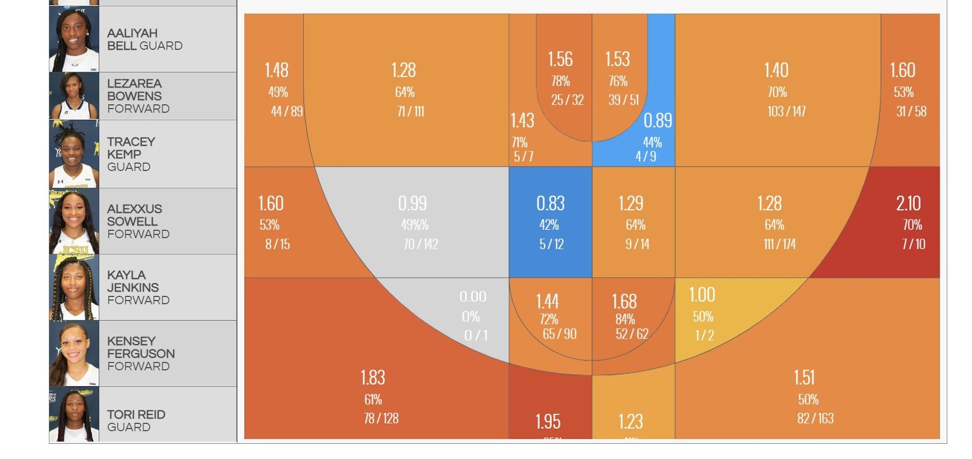 A shot chart takes a half-court view of the floor, splits it into various zones, and tracks where players attempt, make or miss shots. With shooting data, players and teams can identify their strengths and improve shooting weakness from a variety of locations on the floor.