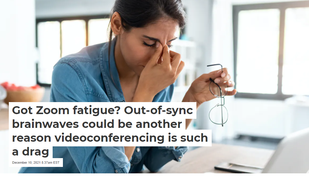 Our experiments demonstrated that the natural rhythm of turn transitions between speakers is disrupted by Zoom. This disruption is consistent with what would happen if the neural ensemble that researchers believe normally synchronizes with speech fell out of sync due to electronic transmission delays.
