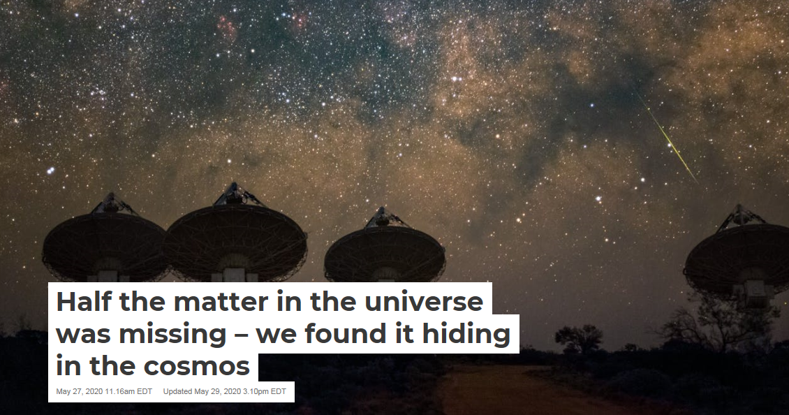 This sparked the missing baryon problem. Provided the law of nature held that matter can be neither created nor destroyed, there were two possible explanations: Either the matter didn’t exist and the math was wrong, or, the matter was out there hiding somewhere.