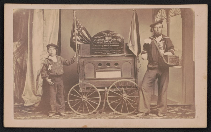 Bernard Tobey, a double amputee, and his son, wearing Union sailor uniforms, standing beside a small wagon displaying Secretary of War Edwin Stanton’s dispatch on the fall of Fort Fisher. Fetter's New Photograph Gallery/Library of Congress