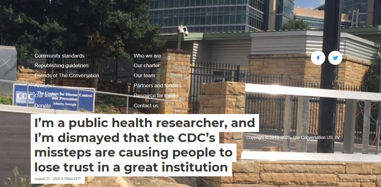 The world is now in the midst of the worst pandemic in over a century. The United States has 4.4% of the world’s population but 24% of COVID-19 cases. Plainly, we are not doing well, and lack of trust in CDC’s guidance as well as contantly changing messaging is hampering our efforts to control the virus. No wonder the public is confused about what they should be doing.