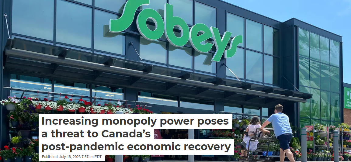 Recent trends indicate this phenomenon is not only persisting, but intensifying. While Sobeys, Loblaws, Metro, Costco and Walmart dominate over 60 per cent of the grocery sector, Bell, Rogers and Telus command about 89 per cent of the wireless telecommunications market.