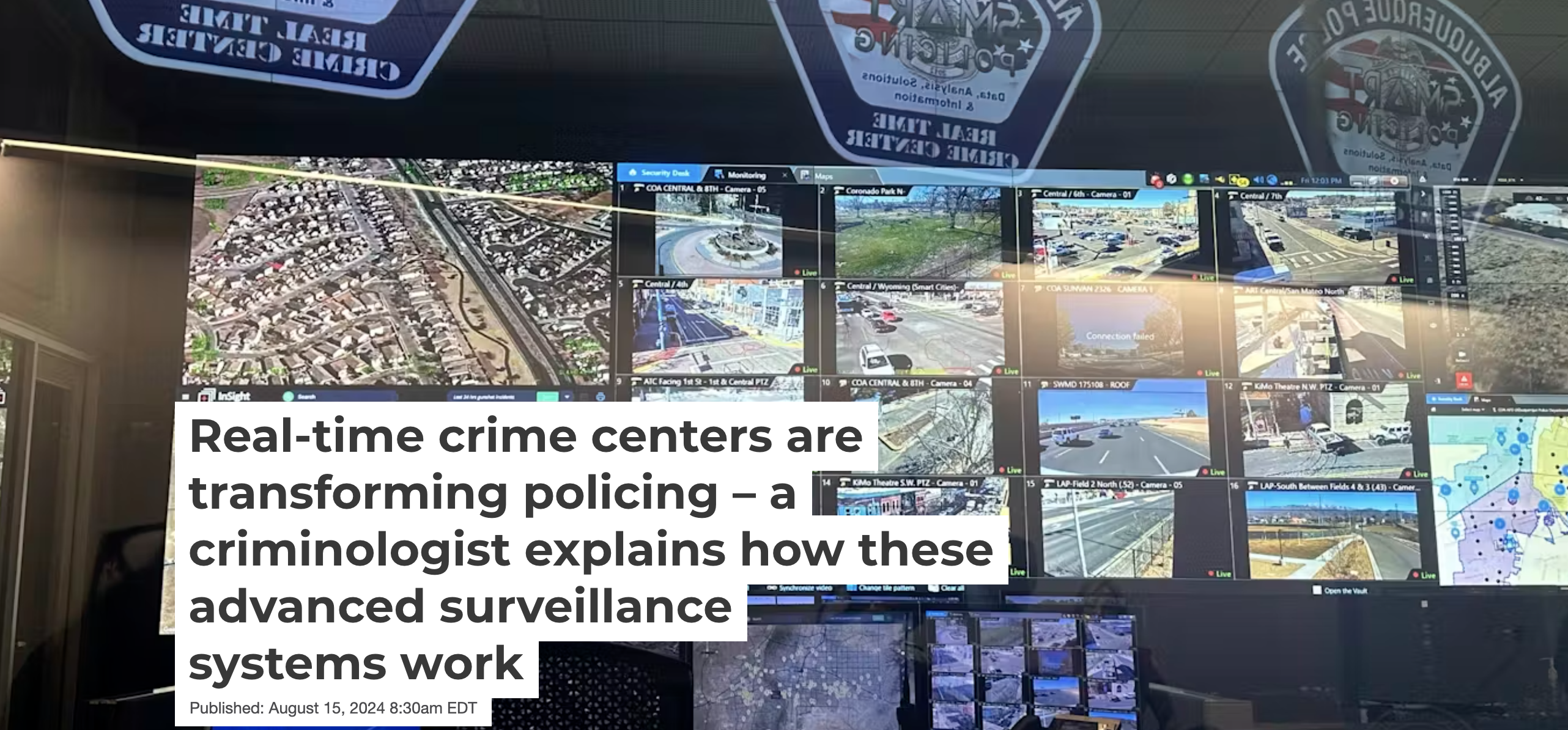 Real-time crime centers are specialized units within police departments that use the latest technology to monitor public spaces and record incidents. The New York City Police Department was the first to institute a real-time crime center in 2005.