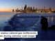 A tall building with an image of a woman figure skating projected on it, next to church steeples and a snow-covered mountain.