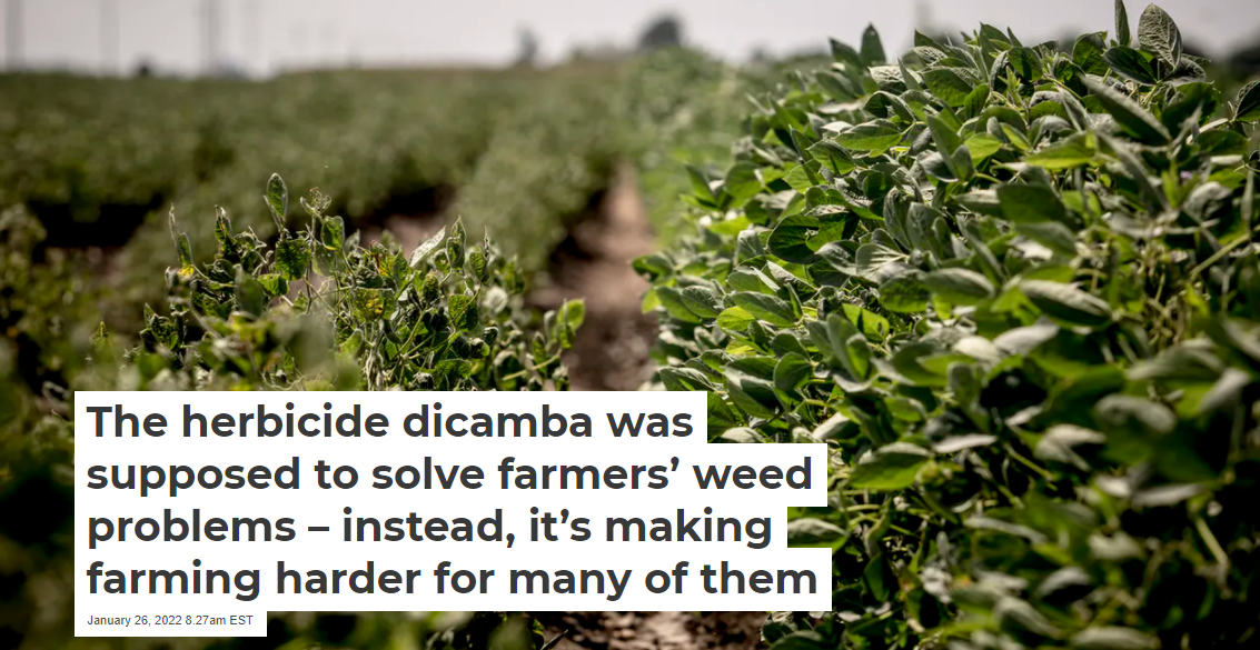In 2021, thousands of U.S. growers reported to the Environmental Protection Agency that dicamba sprayed by other farmers – sometimes up to a mile and a half away – damaged crops in their fields. Complaints came from all over the country.