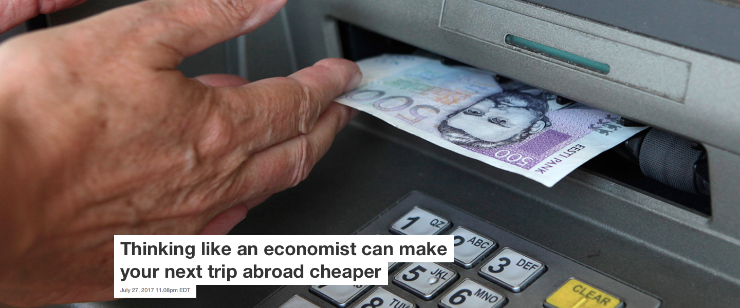 When people travel to a country with a different currency, they often mentally keep track of their spending using their home currency, converting all prices in their heads as they shop and eat. If an ATM or credit card terminal asks if you want to pay for something in the currency you use as your unit of account, your brain says yes.