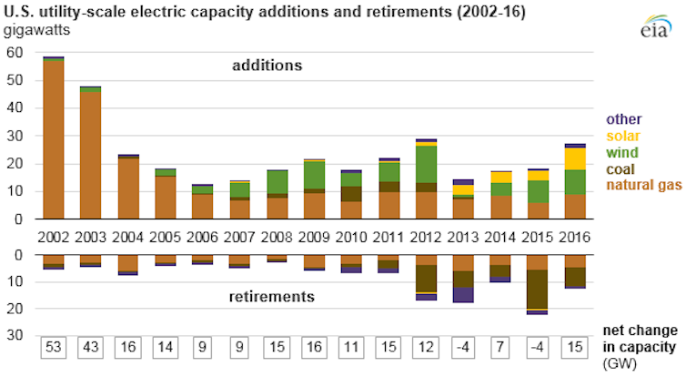 What’s more, coal is rapidly losing market share for economic reasons. Coal faces increased competition from shale natural gas, wind and solar. These fuels produce less pollution than coal and have become much cheaper in the past decade. In the past five years, nearly all new electricity generation capacity added in the United States was powered by natural gas, wind and solar. Nearly all retired plants were powered by coal. Natural gas generated more electricity than coal twice in 2015.