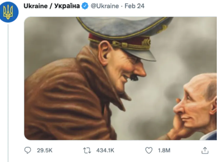 A meme showing Adolf Hitler caressing Russian President Vladimir Putin’s face, tweeted by the official Ukraine state account on Feb. 24, 2022, the day Russia invaded. Official Ukraine Twitter account