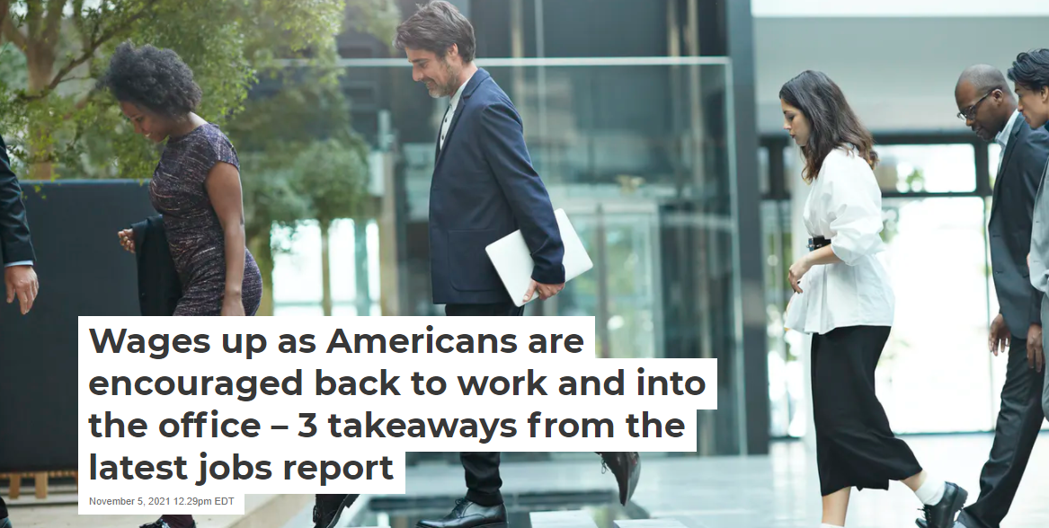 October’s jobs report – which saw strong gains in leisure and hospitality – suggests that peoples’ ability to delay returning to work may be coming to an end and potentially that they are more open to returning to on-site jobs, perhaps encouraged by vaccination rates and falling case numbers.