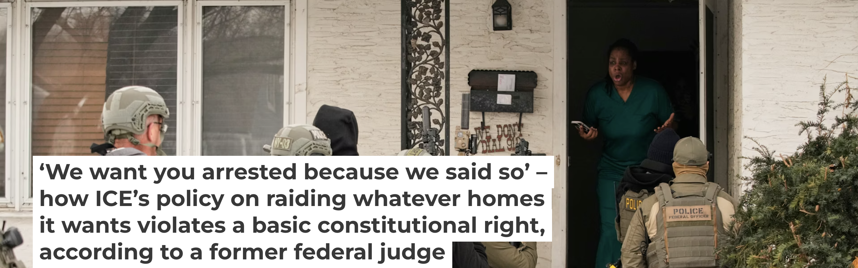 As Immigration and Customs Enforcement, or ICE, agents continued to use aggressive and sometimes violent methods to make arrests in its mass deportation campaign, including breaking down doors in Minneapolis homes, a bombshell report from the Associated Press on Jan. 21, 2026, said that an internal ICE memo – acquired via a whistleblower – asserted that immigration officers could enter a home without a judge’s warrant. That policy, the report said, constituted “a sharp reversal of longstanding guidance meant to respect constitutional limits on government searches.”
