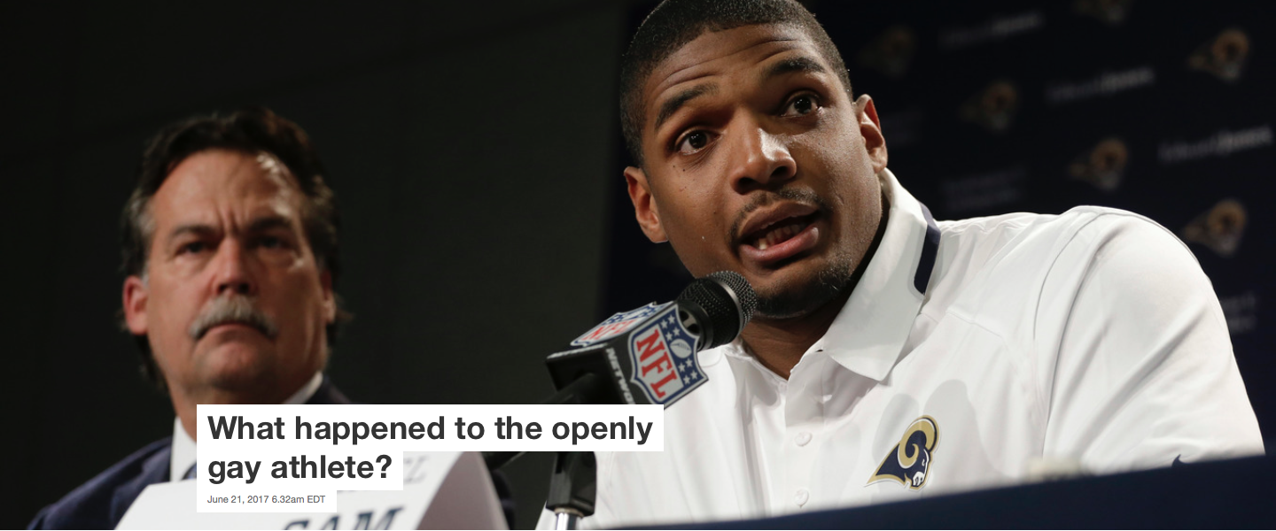 Erik Hall, a freelance sports journalist, worked on the Sam story while a student at Missouri. His master’s thesis analyzed coverage of the lineman’s coming out saga, and he believes that this downward trend in news coverage can be explained quite simply: All those big stories raised the bar. For major mainstream publications, the story of a high school athlete coming out isn’t really that significant any more. To make it a national news story, it has to be a big name – a starter on an NBA, MLB, NHL or NFL team.