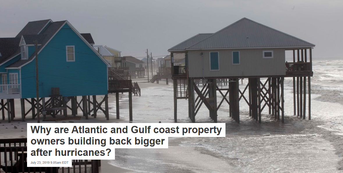 As geoscientists, we are interested in natural physical processes of coastal change and in how human decisions interact with natural processes. In our research on broad development trends in hurricane alleys of the U.S. Atlantic and Gulf coasts, we have found that houses rebuilt in the years following a hurricane typically increased in size relative to their original footprints.
