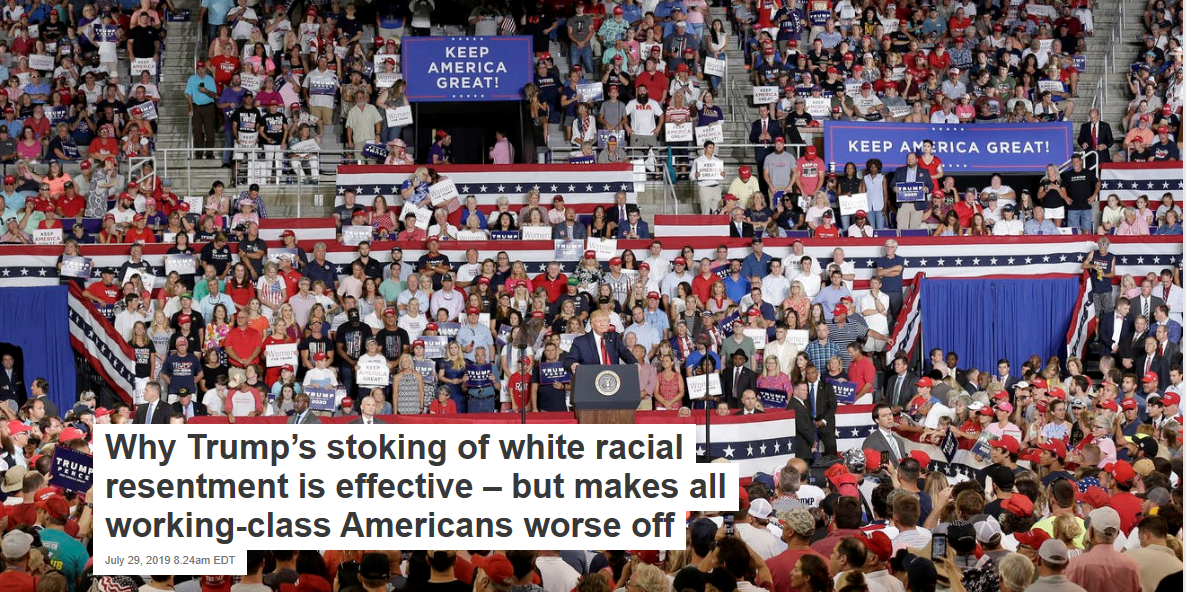 This resentment probably explains why working-class whites, particularly men, are so receptive to President Trump’s anti-immigrant and racist messages – and why he targets them.