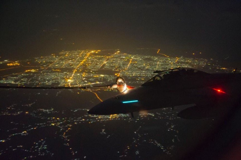 An Australian Super Hornet refuels from a KC30 tanker while flying over Iraq. @VCDF_Australia/Twitter