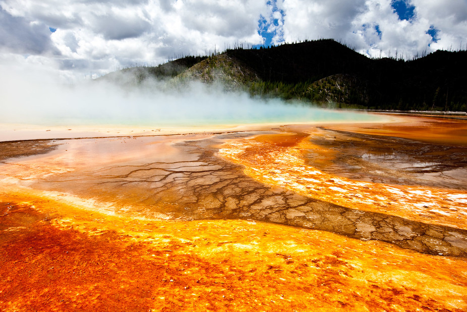 Yellowstone volcano is composed of an immense volcanic crater – known as a caldera – more more than 70km (44 miles) in length, most of which lies within Yellowstone National Park. The volcano rarely erupts lava (it last did so about 70,000 years ago, but the magma lying beneath the surface gives rise to spectacular geothermal features, such as geysers and colourful hot springs.