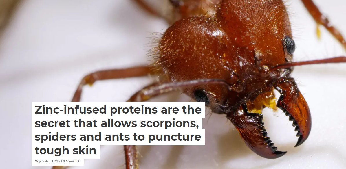 From an evolutionary perspective, these materials allow smaller animals to consume tougher foods. And the energy saved by using less force during cutting can be important for any animal. These advantages may explain the widespread use of heavy element biomaterials in nature – most ants, many other insects, spiders and their relatives, marine worms, crustaceans and many other types of organisms use them.